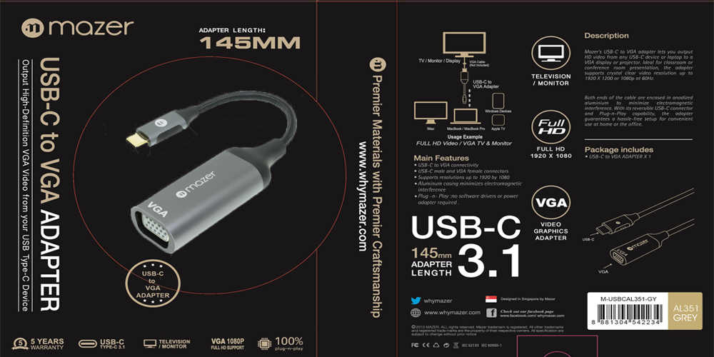 Có thanh toán bằng VNPAY QR nhanh chóng tiện lợiBộ Chuyển Đổi Mazer ALU USB-C to VGA 1080P Adapter, hỗ trợ độ phân giải HD lên đến 1920 x 1200 hoặc 1080p ở 60Hz.