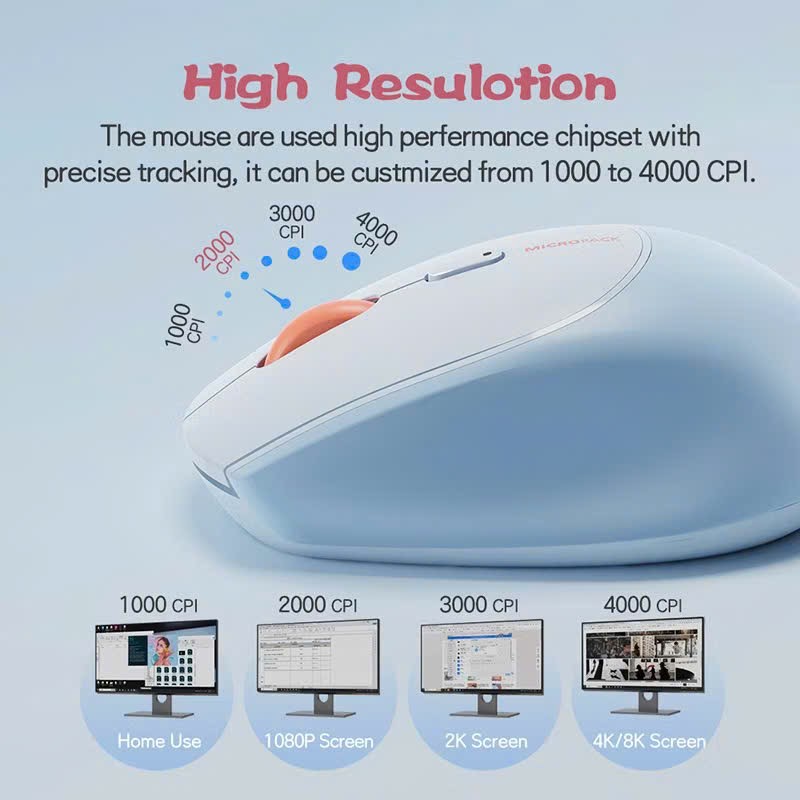 Độ phân giải tùy chỉnh linh hoạt: Chuột không dây MicroPack Soft Silicone Lifestyle MS-201W có thể điều chỉnh DPI từ 1000 đến 4000, đáp ứng tốt mọi nhu cầu sử dụng từ làm việc văn phòng đến chỉnh sửa hình ảnh và chơi game.