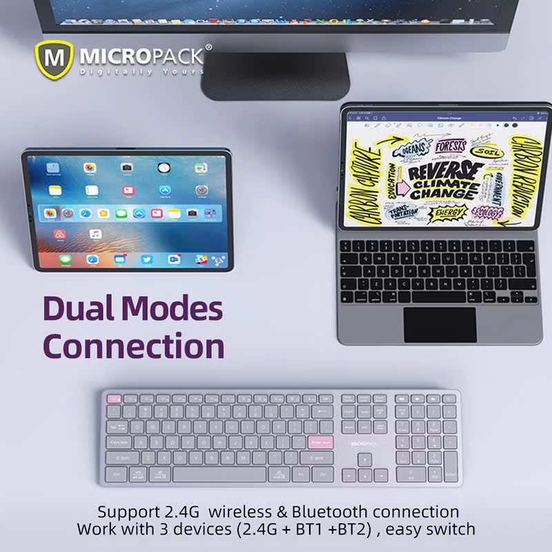 Bàn phím không dây MicroPack Lifestyle K-310W hỗ trợ kết nối không dây 2.4G và Bluetooth, cho phép bạn sử dụng cùng lúc trên 3 thiết bị (2.4G + BT1 + BT2). Chỉ cần một thao tác bấm nút, bạn có thể chuyển đổi giữa các thiết bị cực kỳ tiện lợi.