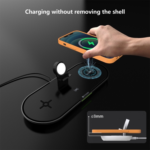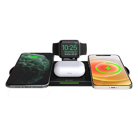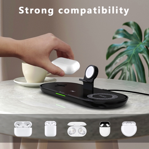 - Bộ sạc không dây tương thích MagSafe (4 trong 1) sạc được: 2 x điện thoại Qi Wireless và 1x Airpods hoặc Pro và 1x Apple Watch cùng lúc.