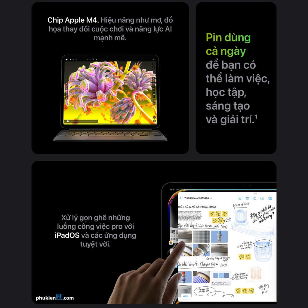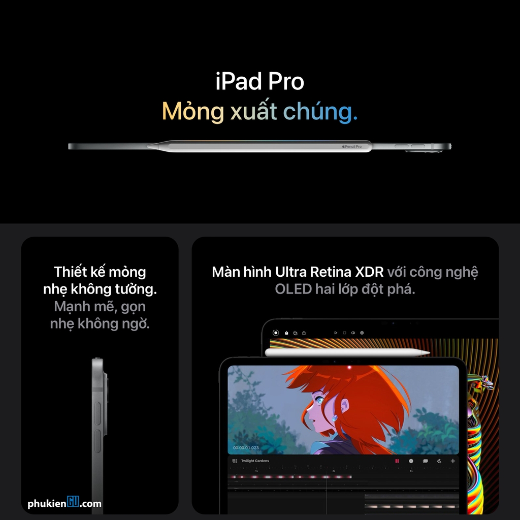 - iPad Pro mỏng nhất: độ dày 5.1mm (phiên bản 13 inch), 5.3mm (phiên bản 11 inch)