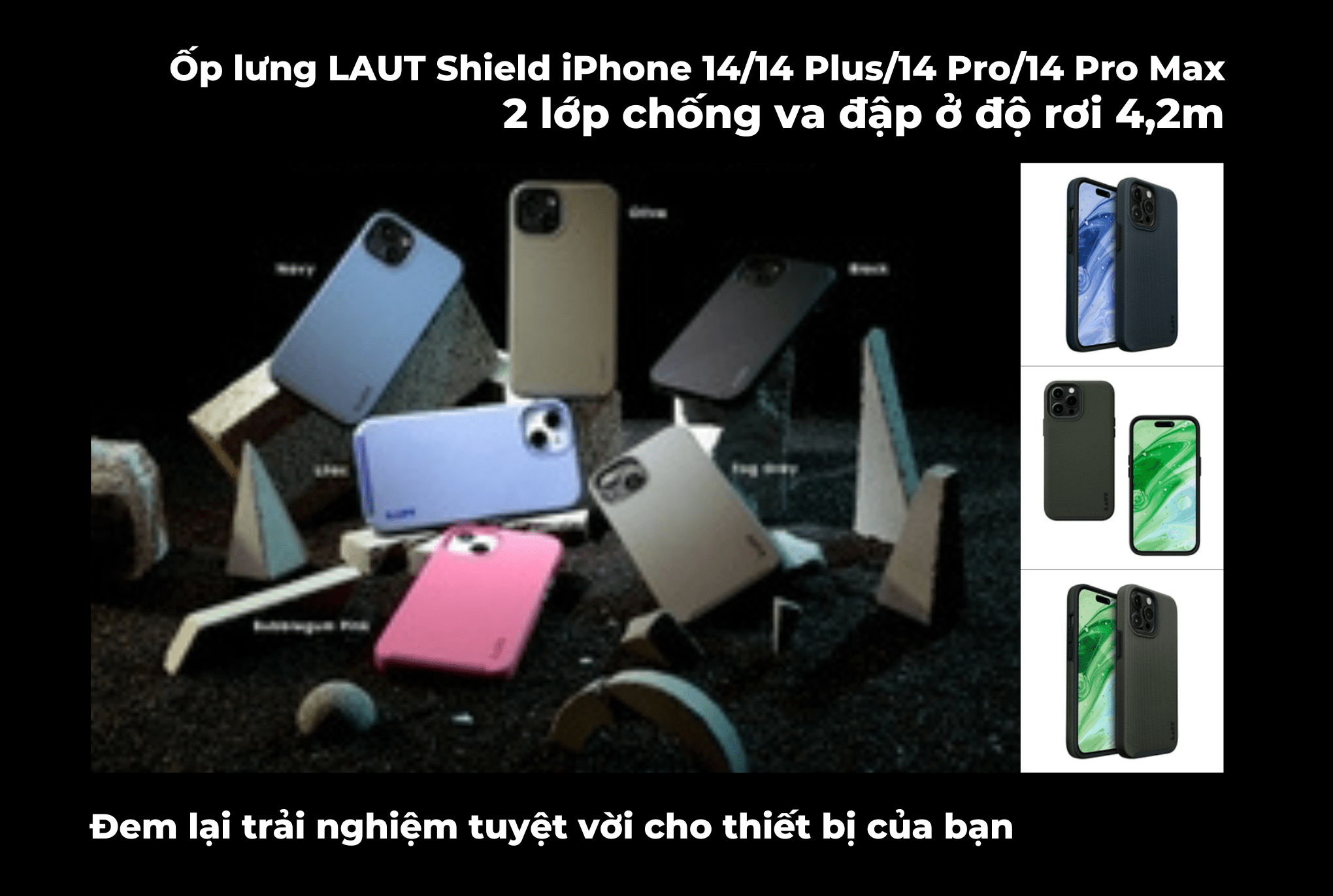 Xem ngay sản phẩm: Ốp lưng LAUT Shield For iPhone 14/14 Plus/14 Pro/14 Pro Max 2 lớp chống va đập ở độ rơi 4,2m