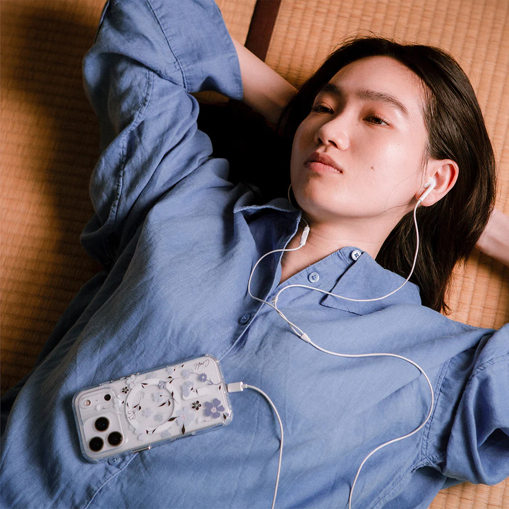 • Ốp lưng trong suốt với họa tiết hoa tím lilac nhẹ nhàng, được đính pha lê 3D Illumine™ lấp lánh nằm gọn giữa những cánh hoa.