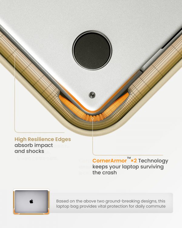 Thiết kế ứng dụng công nghệ sáng chế của Hoa Kỳ [CornerArmor] ở các góc dưới cùng giúp bảo vệ máy tính xách tay của bạn khỏi các tai nạn như một túi khí ô tô. Lớp lót lông cừu mềm mại với đệm dày ở ngăn chính giúp bảo vệ máy tính xách tay khỏi trầy xước và va đập hàng ngày. Vỏ này cung cấp khả năng bảo vệ mạnh mẽ cho các vật dụng cần thiết hàng ngày trong khi vẫn làm nổi bật lên các đường nét tối giản thanh lịch