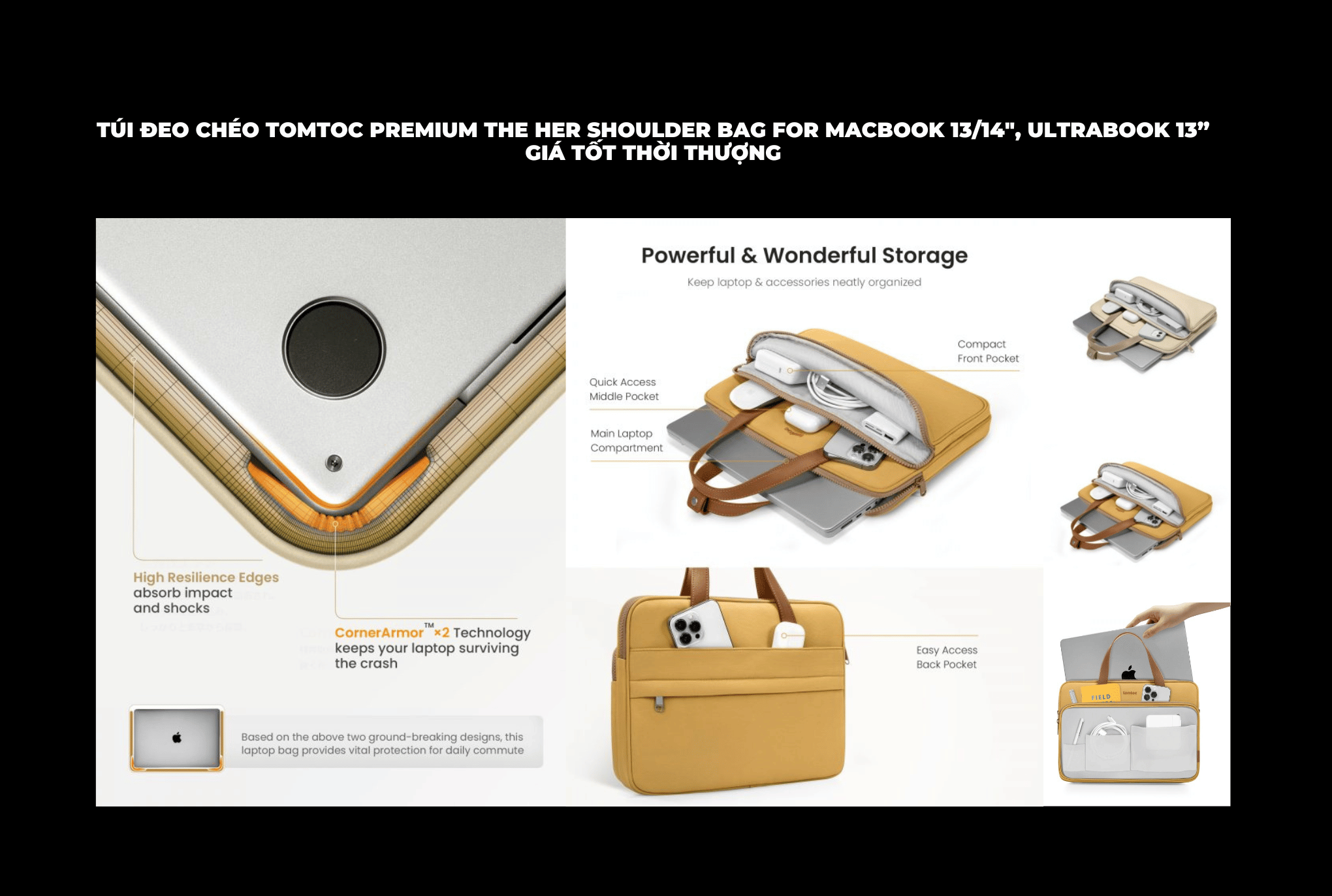 Túi đeo chéo Tomtoc Premium The Her Shoulder Bag For Macbook 13/14", Ultrabook 13” giá tốt là một sản phẩm đáng chú ý, vượt trội về thiết kế và tính năng; Với sự kết hợp tinh tế giữa thời trang và công nghệ chống sốc Corner Armor, sản phẩm này không chỉ mang đến vẻ ngoài cuốn hút và phong cách lịch lãm, mà còn bảo vệ máy tính xách tay một cách tối đa.
